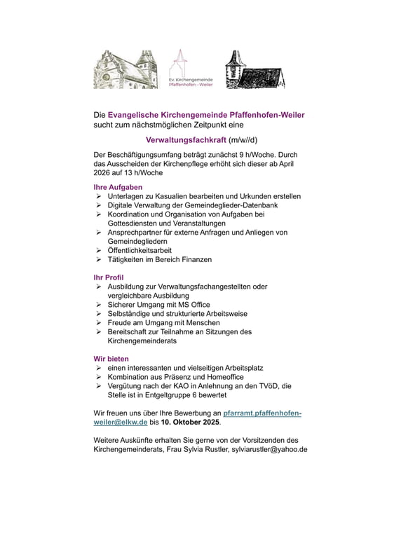 Mitarbeiter: Mesner/in, Kirchenpflege, Hausmeister Gemeindehäuser, Pfarramt