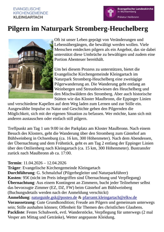 Zweitägige Pilgerwanderung im Naturpark Stromberg - Heuchelberg vom 11.04.2026 bis zum 12.04.2026